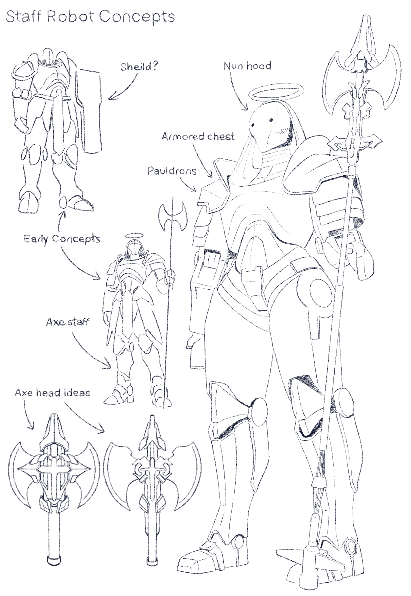 In developing its visual language, I explored imagery rooted in nun vestments and medieval armor. By merging the iconography of a nun’s habit with the severity of a weaponized staff, bordering on the silhouette of an axe, I aimed to create a visual tension between devotion and violence. The result is a figure that feels both sacred and militant, evoking the uneasy overlap between faith, authority, and force.