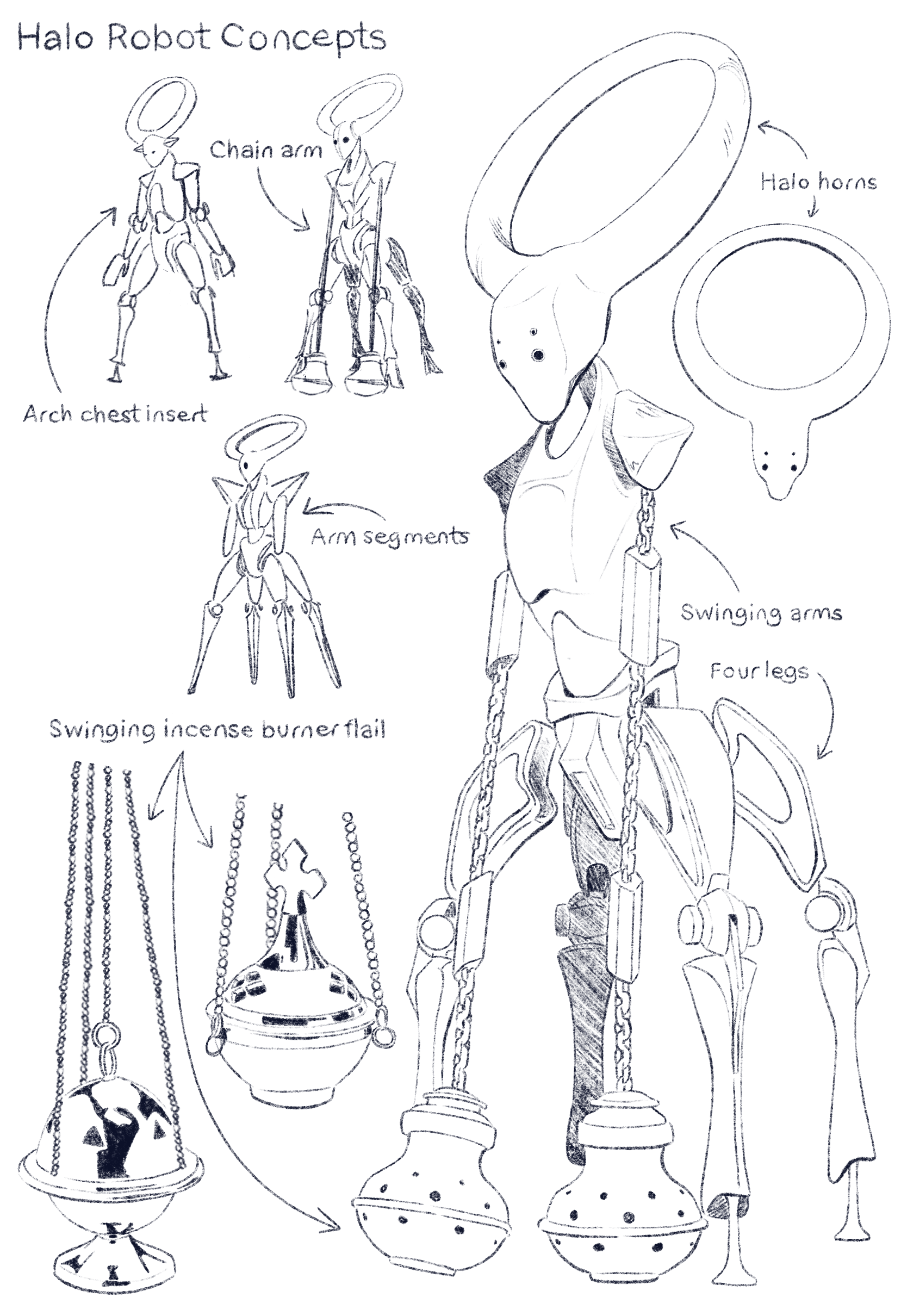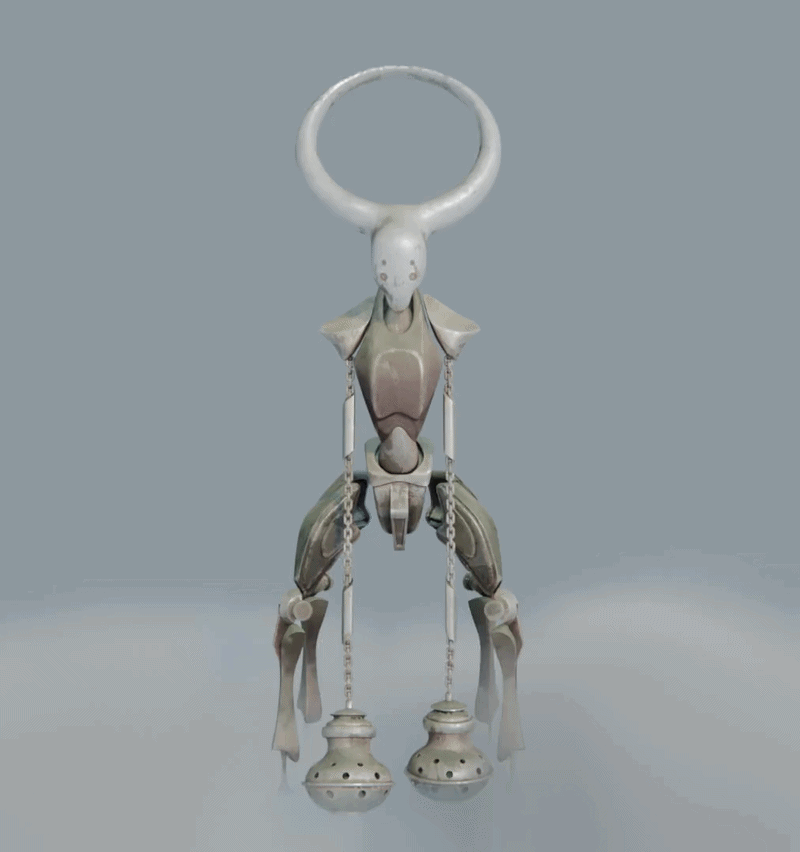 In developing its visual language, I began exploring imagery rooted in ritual and purification. The idea of swinging incense flails became a central influence, tools traditionally used to cleanse sacred spaces. I was drawn to the tension between sanctity and violence: a ceremonial object repurposed as a weapon, cleansing not through smoke, but through force. The Halo Robot embodies that contradiction, operating as both guardian and executioner. Purifying its environment by eliminating perceived threats.
