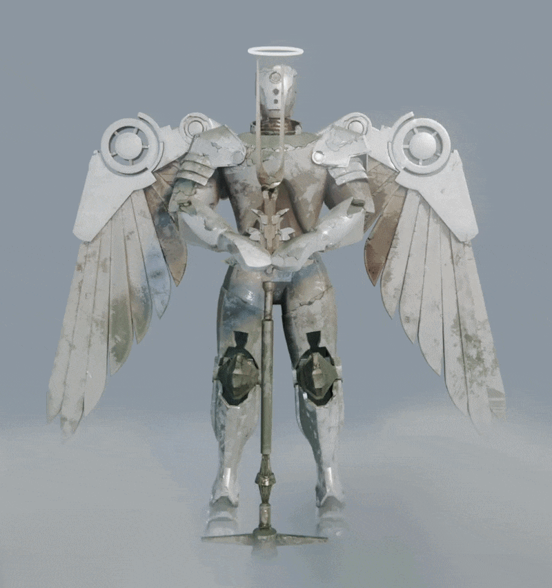 In developing its visual language, I drew from angelic iconography and ecclesiastical sculpture. The feather-like wing panels reference cathedral carvings, translated into layered metal plating, while the thin halo and elongated head reinforce a sense of divinity through industrial form. The weathered, stone-like patina of the armor evokes aged statuary, positioning the Winged Robot between guardian and judge, an embodiment of protection tempered by judgment.