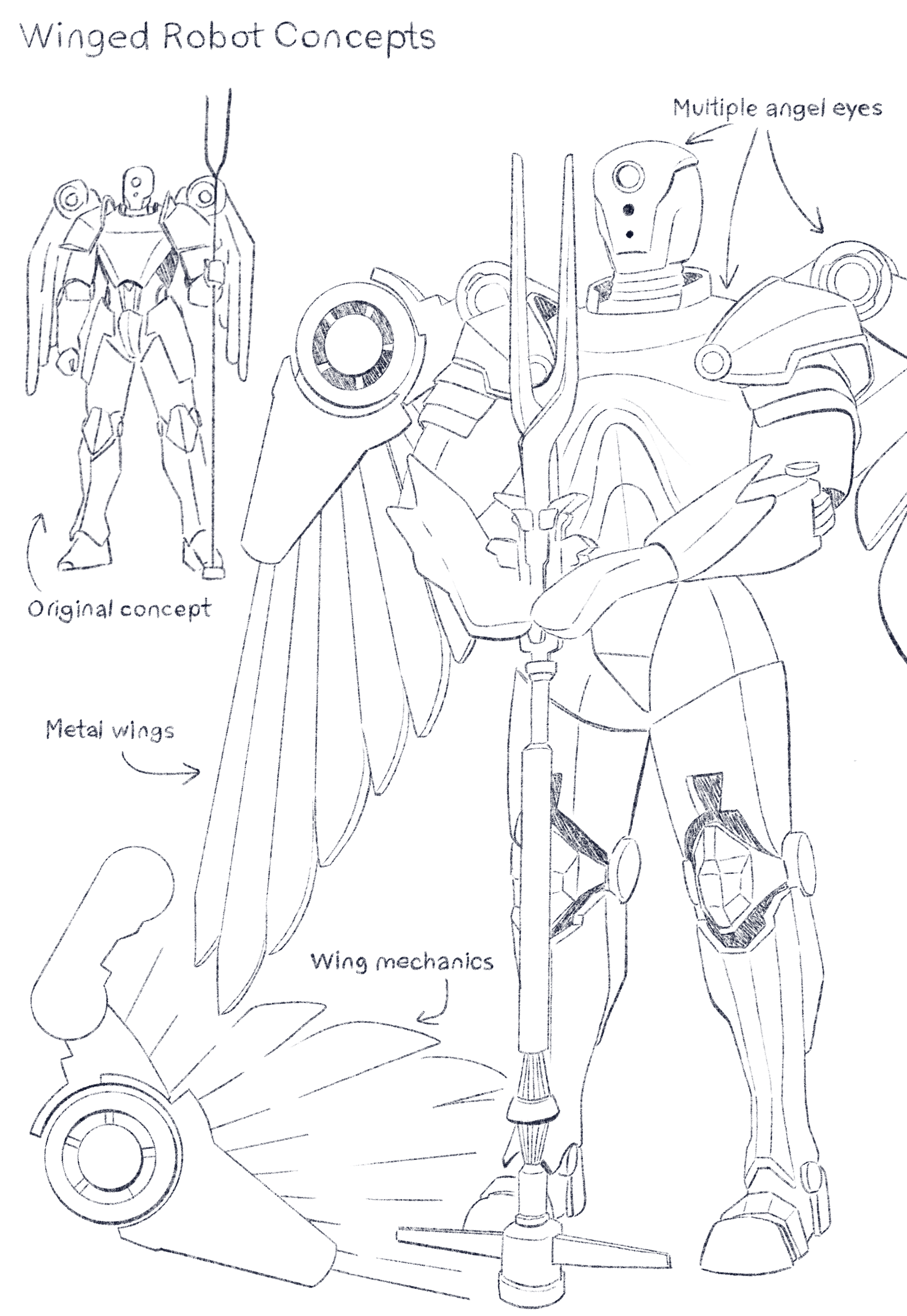 The third robot designed for this project is the Winged Robot, named for the large mechanical wings extending from its shoulders. From the outset, I wanted it to feel reverent and ceremonial, less outwardly aggressive, but still commanding. Its upright posture and the grounded staff suggest restraint and quiet authority rather than immediate attack.